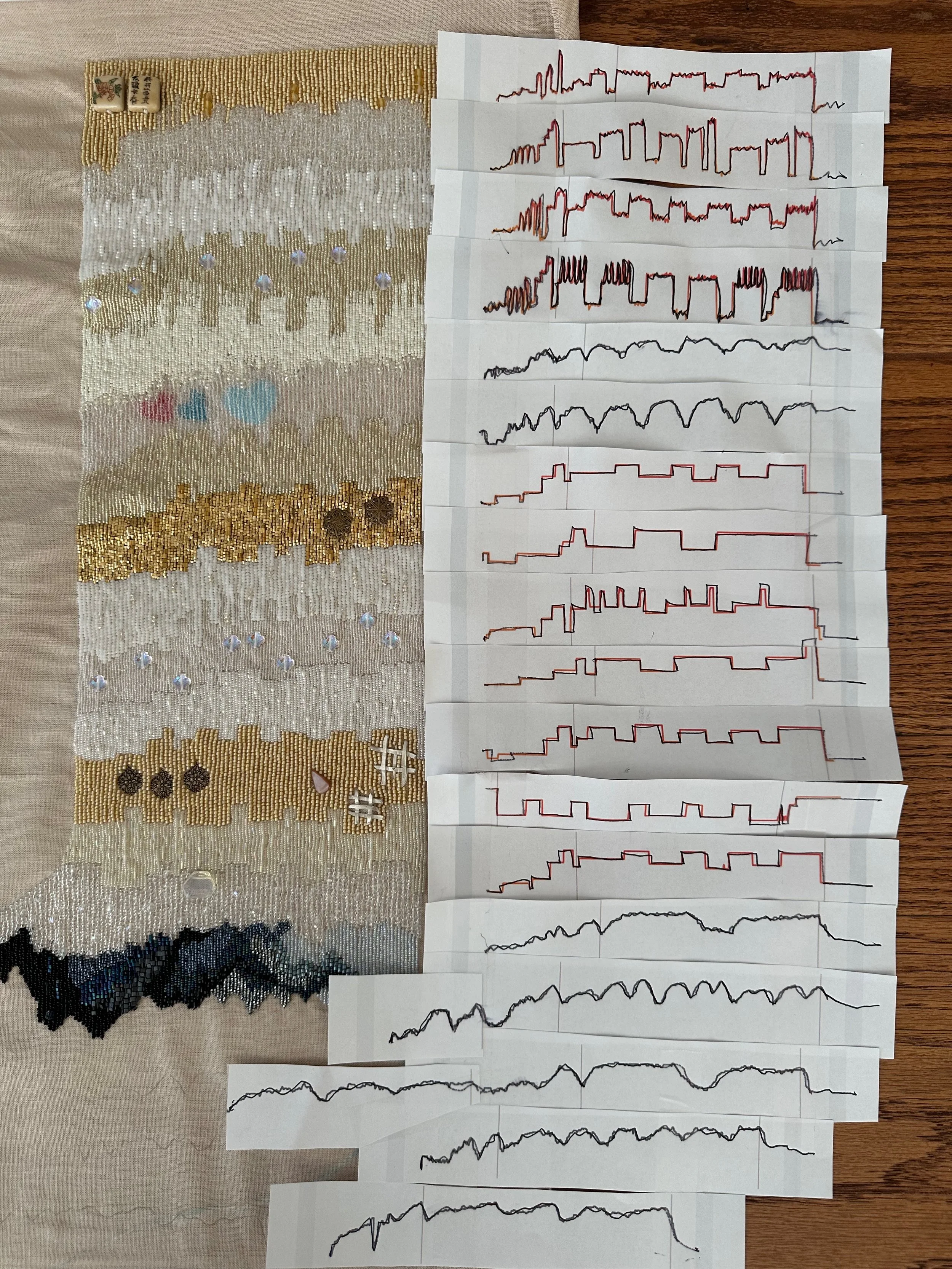jan. 13, 2025: going well. just doing it. plan and pattern are set. straight line beads go pretty fast. i do wonder if it might look good to emphasize the pattern between colors. might try a few things at some point and see how they look. might be more compelling.