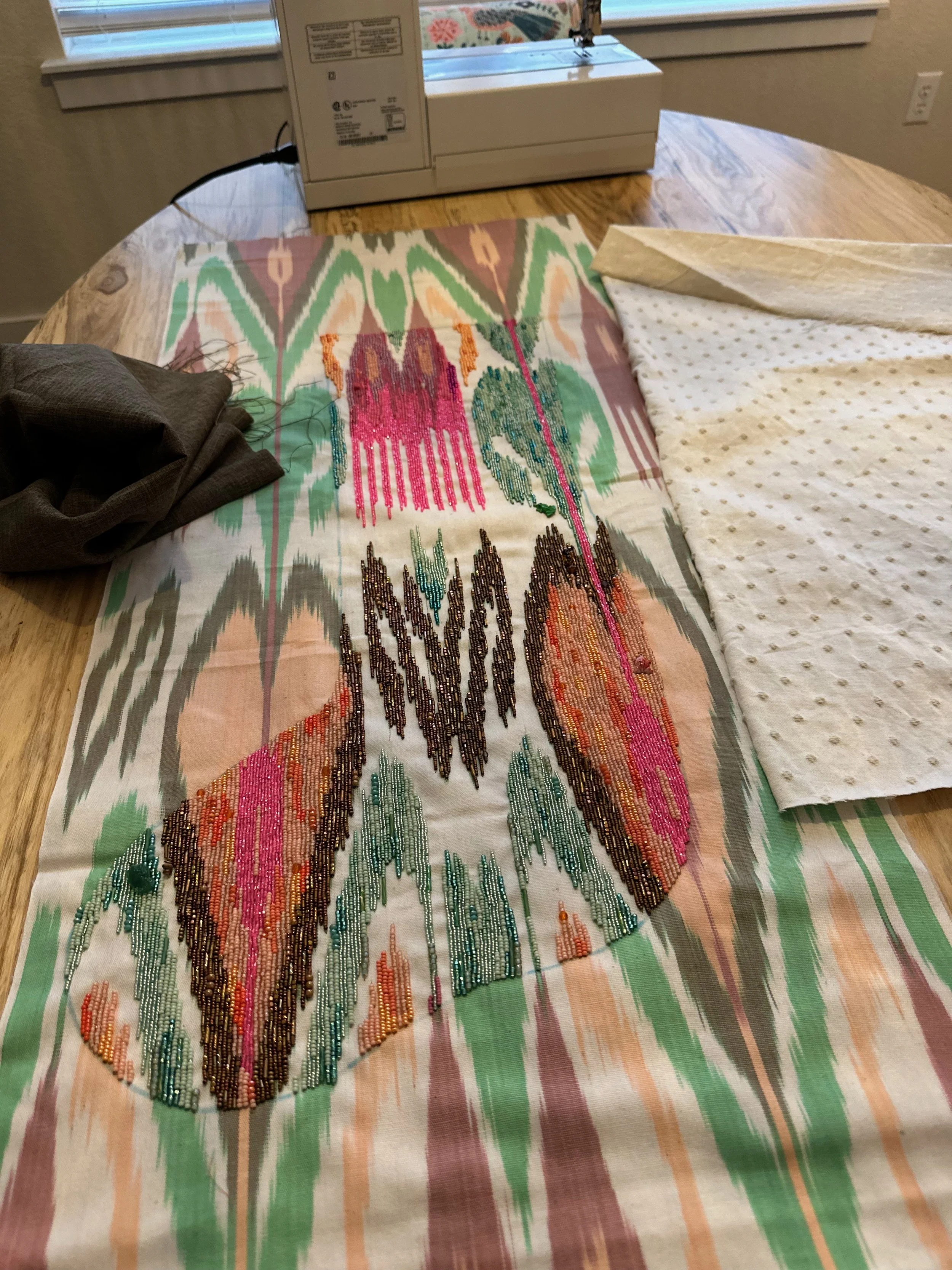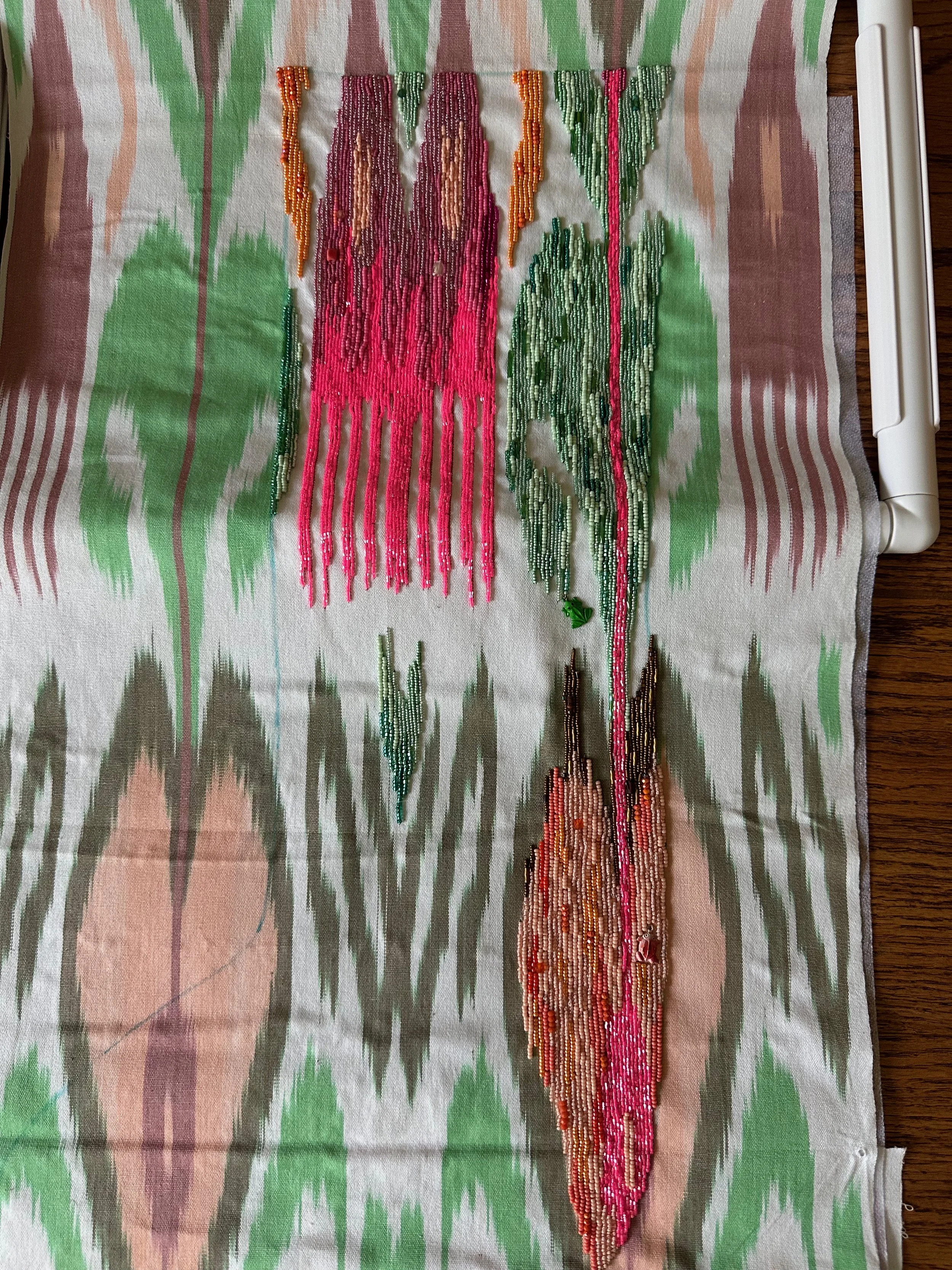 this project is great. i get to think about the time in uzbekistan with my mom and be creative now. idk if the fabric is better with beads. it can certainly stand on it’s own without my embellishment. but the joy of working on it makes it great. thanks, mom, for the best trip.
