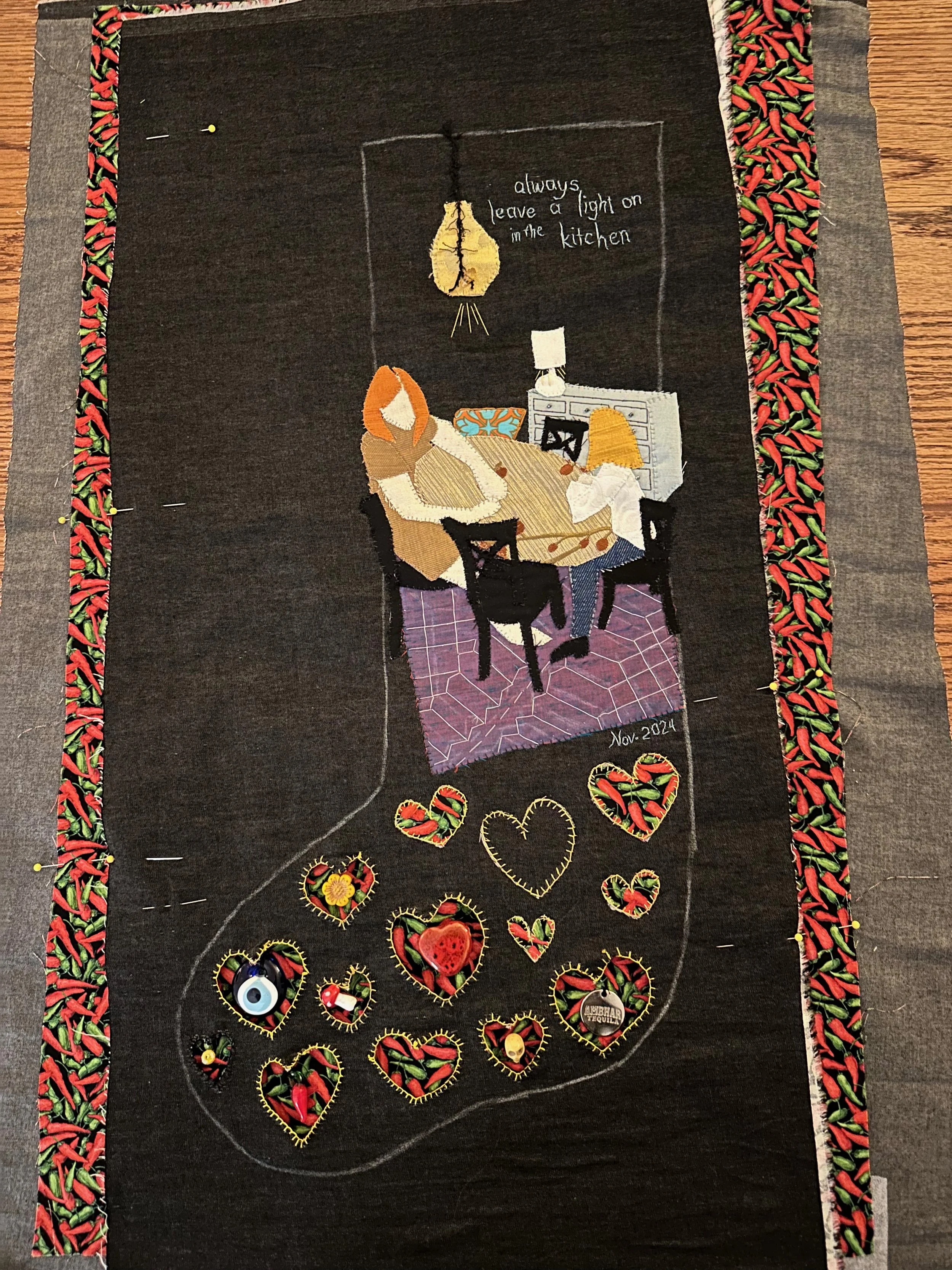It’s my first piece using negative space — each heart a cutout revealing chiles on the lining, and tiny memory treasures tucked inside.