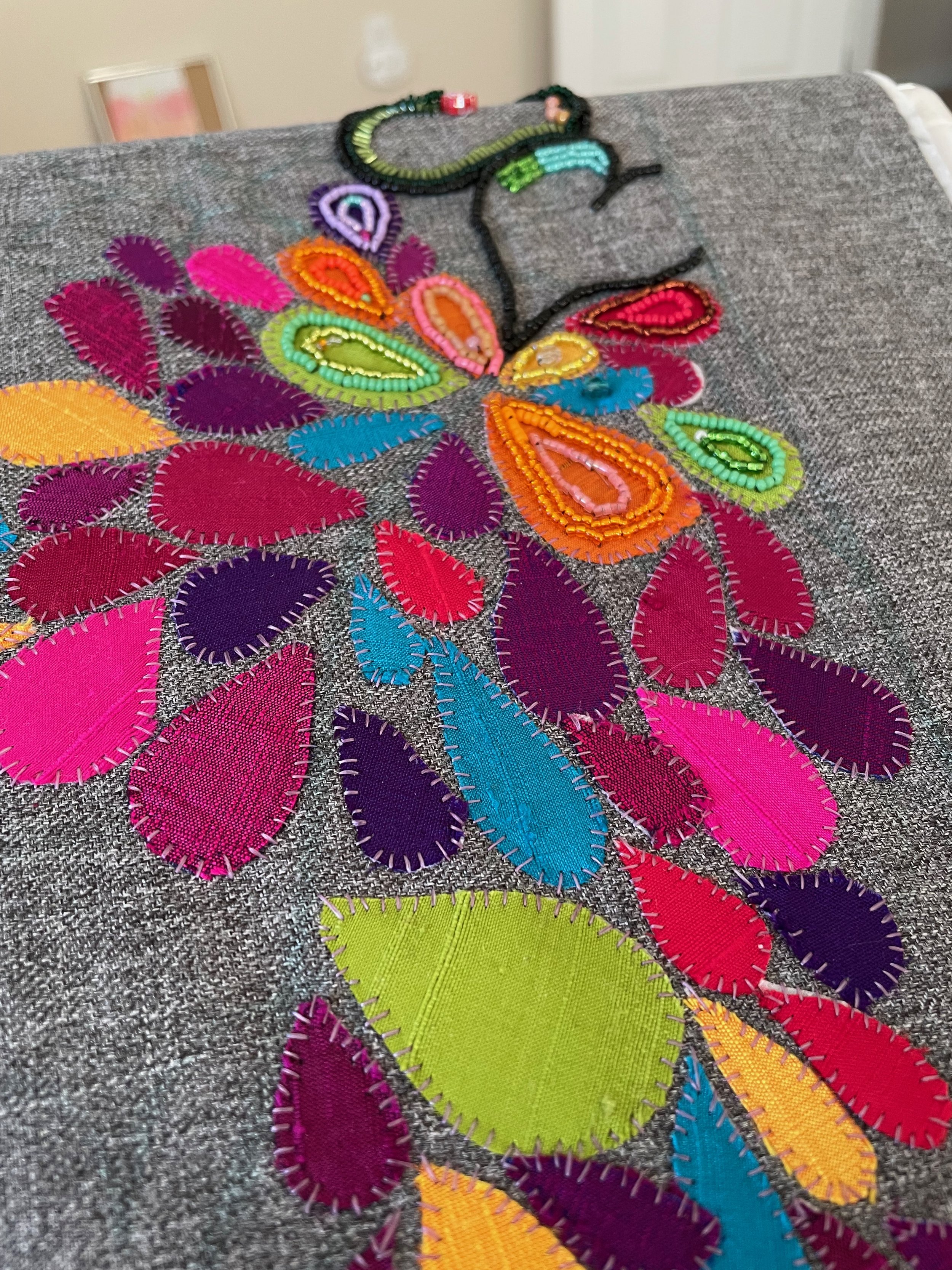 so much done! a couple of creative decisions. i think the leaves might be better as a mix of silk and bead, not just bead. and the flower petals could some outline for definition. thread? and the stamens of thread, too?